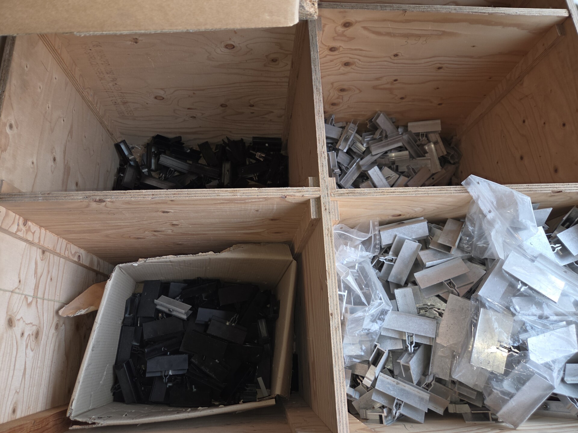 Grand choix de crochets de fixation pour toiture, clamps, visserie, etc. A voir sur place !